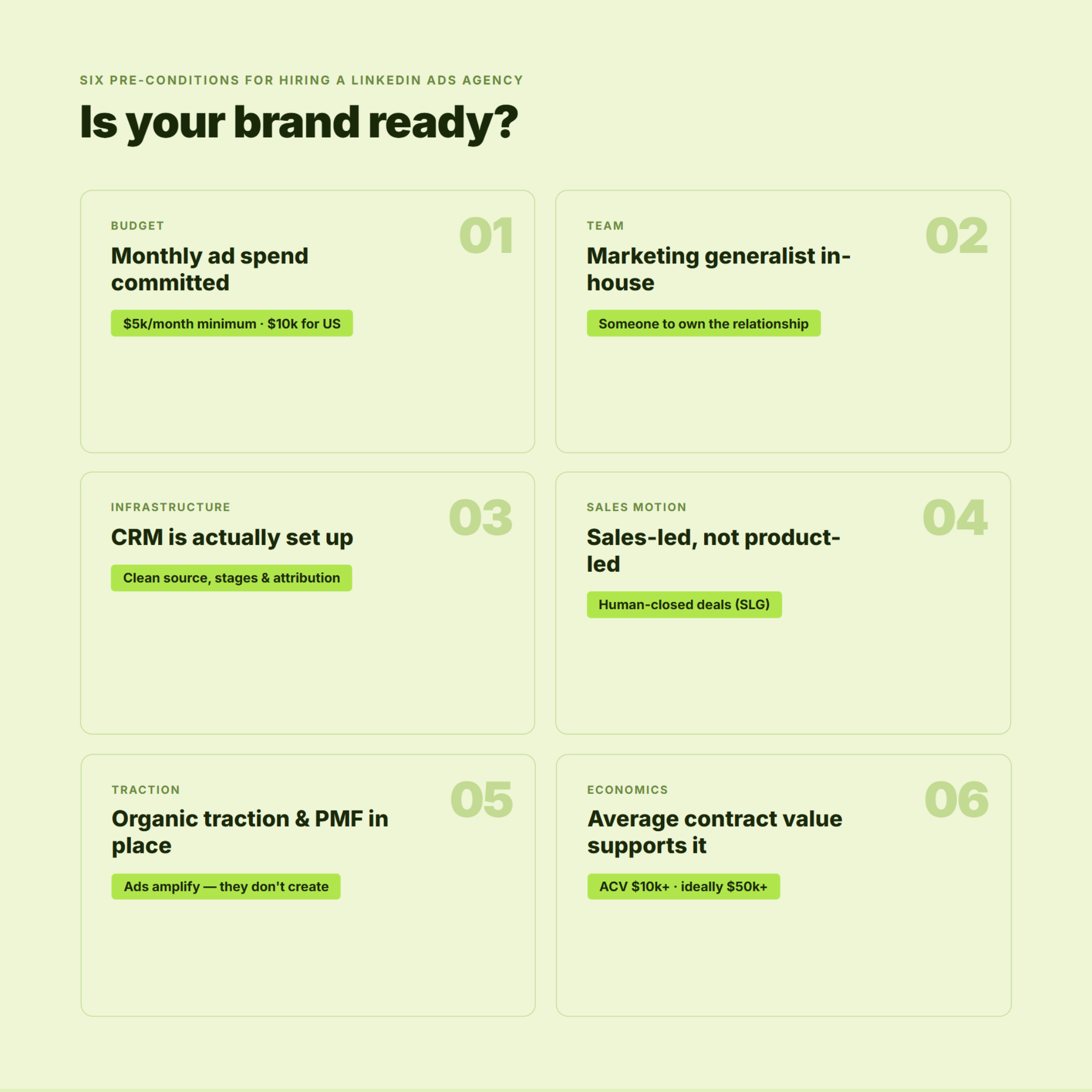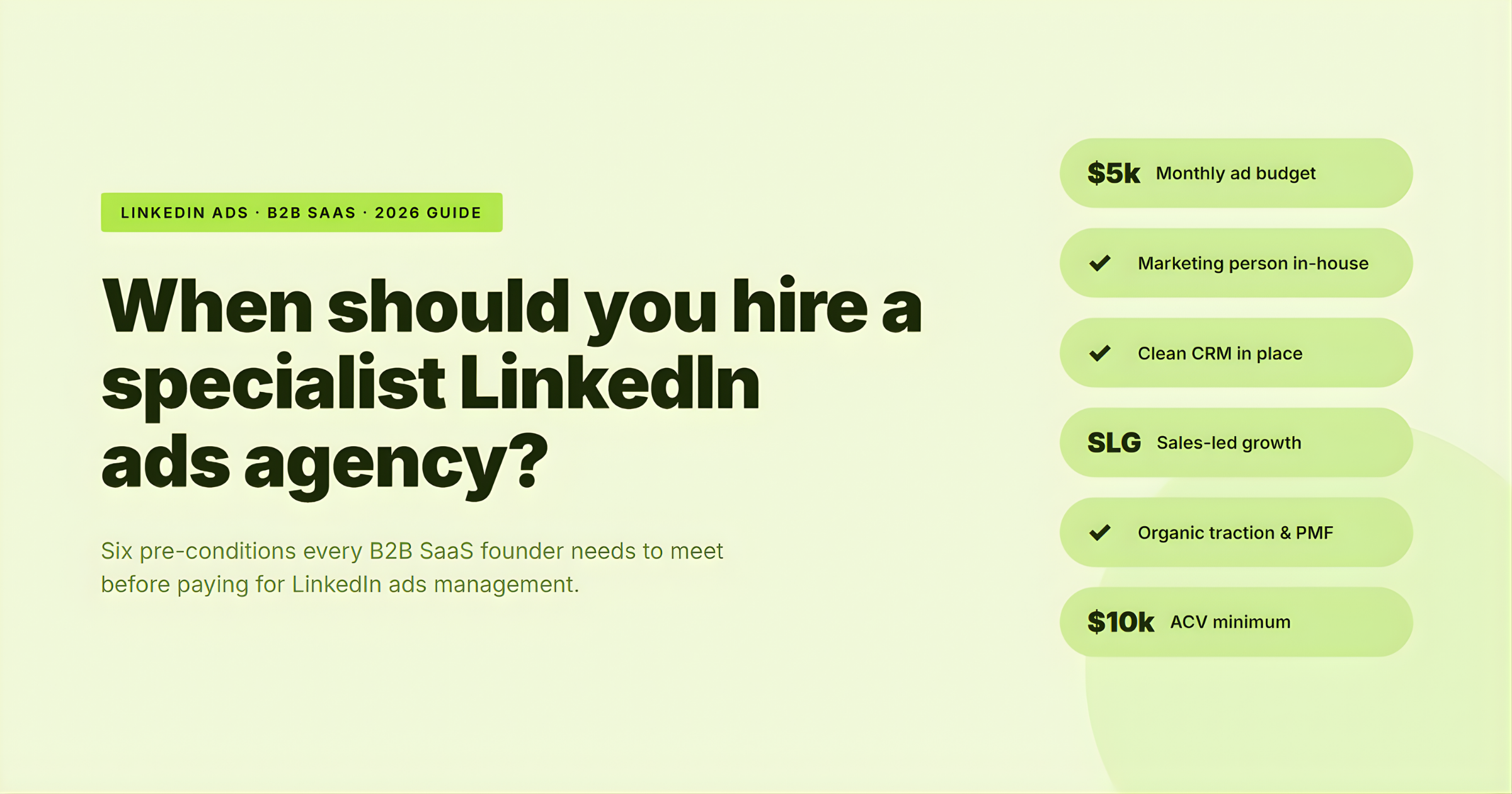When you have at least $5k/month in LinkedIn ad budget, a marketing generalist in-house, a clean CRM, sales-led motion, organic traction, and an ACV of at least $10k. Below those thresholds, LinkedIn ads management services are usually premature.