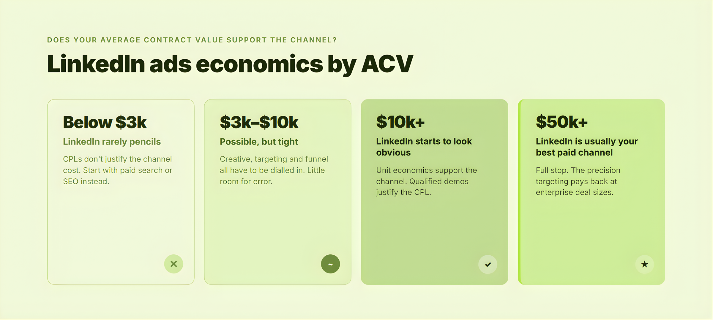 If your ACV is low and you can't see a credible path to expansion revenue, hiring a LinkedIn ads management agency won't fix the unit economics. The channel is structurally expensive, and that doesn't change because you hired a better operator.