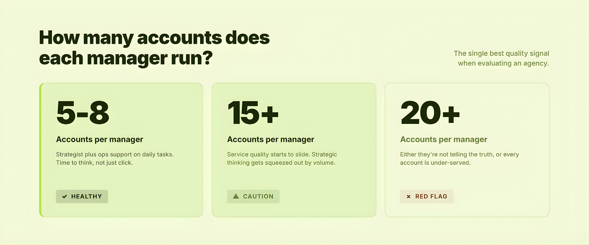 "Our senior strategist runs 20 accounts." → Either that's a lie or every one of those accounts is under-served.