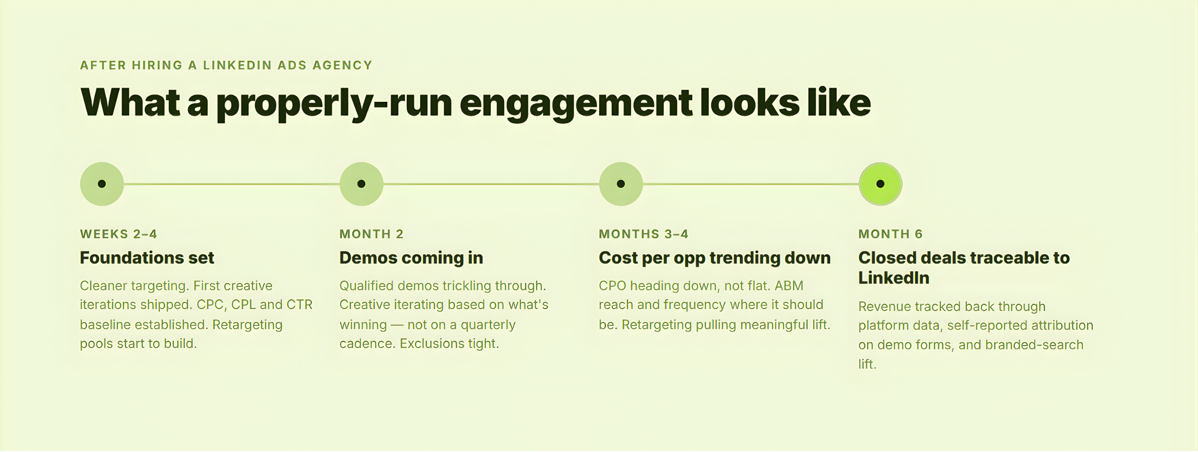 Rough timeline for a properly-run LinkedIn ads management engagement: