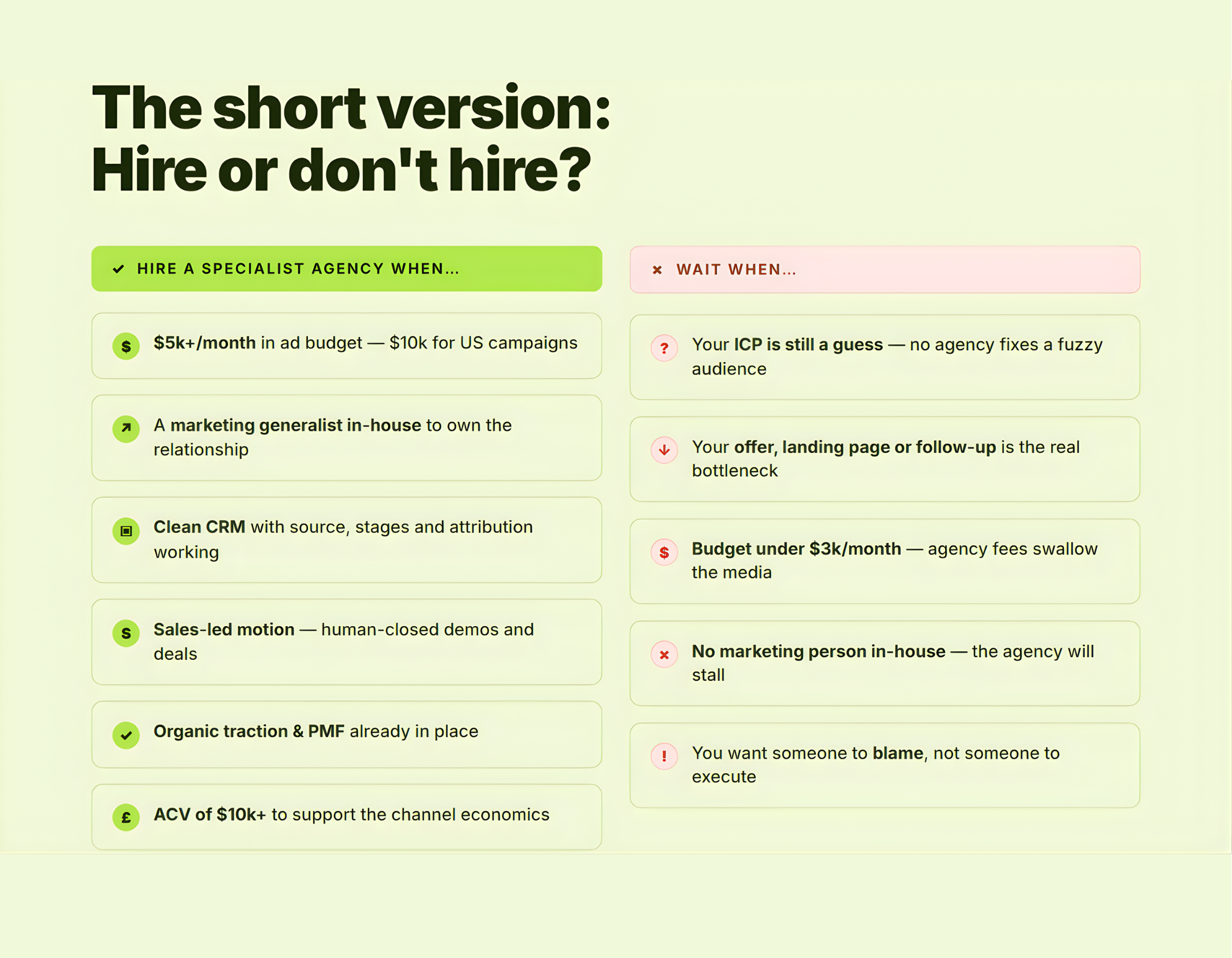 If you don't yet have a marketing generalist, hire that role before you hire a LinkedIn ads agency. One good in-house marketer working with a specialist LinkedIn advertising agency will outperform three agencies working with no internal counterpart. Every time.